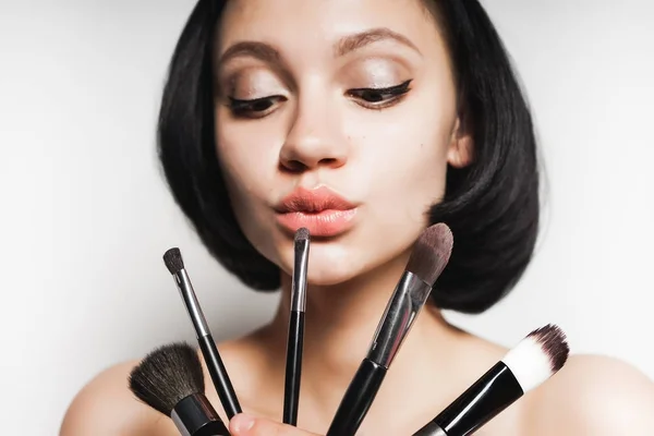 Menina Sorridente Feliz Com Cabelo Preto Tem Nas Mãos Um Pincel